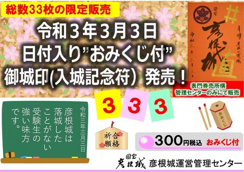 3月3日、彦根城において限定御城印が販売されます。 御城印は通常販売されているものと同じで、おみくじがオマケとしてついているそうです。
