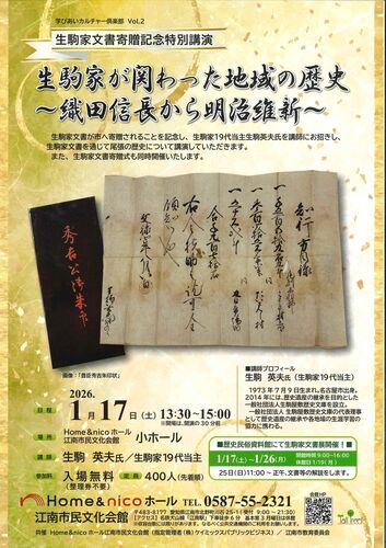 来年1月17日(土)、江南市民文化会館(愛知県江南市)において生駒家文書寄贈記念特別講演「生駒家が関わった地域の歴史~織田信長から明治維新~」が開催されます。参加無料、事前申込不要。