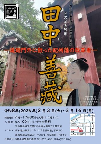 2月3日(火)から3月16日(月)までの間、わかやま歴史館(和歌山県和歌山市)において冬の企画展示「田中善蔵―追廻門外に散った紀州藩の改革者―」が開催されます。