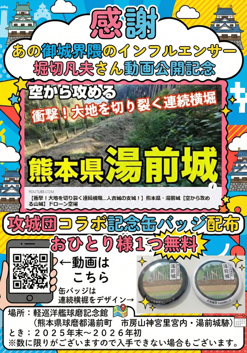12月27日(土)から、軽巡洋艦球磨記念館(熊本県湯前町)において攻城団とのコラボグッズ(ご当地缶バッジ・湯前城)が数量限定で無料配布されます。