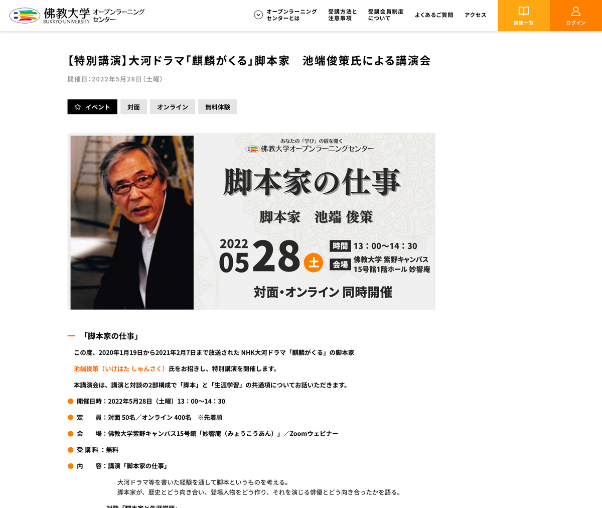 5月28日、佛教大学紫野キャンパスにおいて大河ドラマ「麒麟がくる」の脚本家、池端俊策氏による講演会が開催されます。