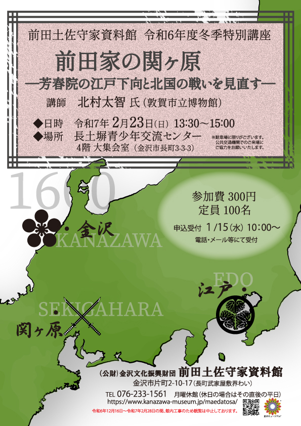 来年2月23日(日)、長土塀青少年交流センター(石川県金沢市)において令和6年度 冬季特別講座「前田家の関ヶ原―芳春院の江戸下向と北国の戦いを見直す―」が開催されます。参加費300円、定員100人、要事前申込。