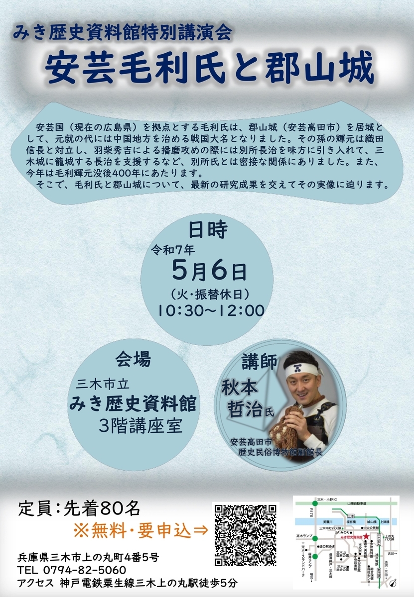 5月6日(火・振休)、みき歴史資料館(兵庫県三木市)において特別講演会「安芸毛利氏と郡山城」が開催されます。要事前申込。