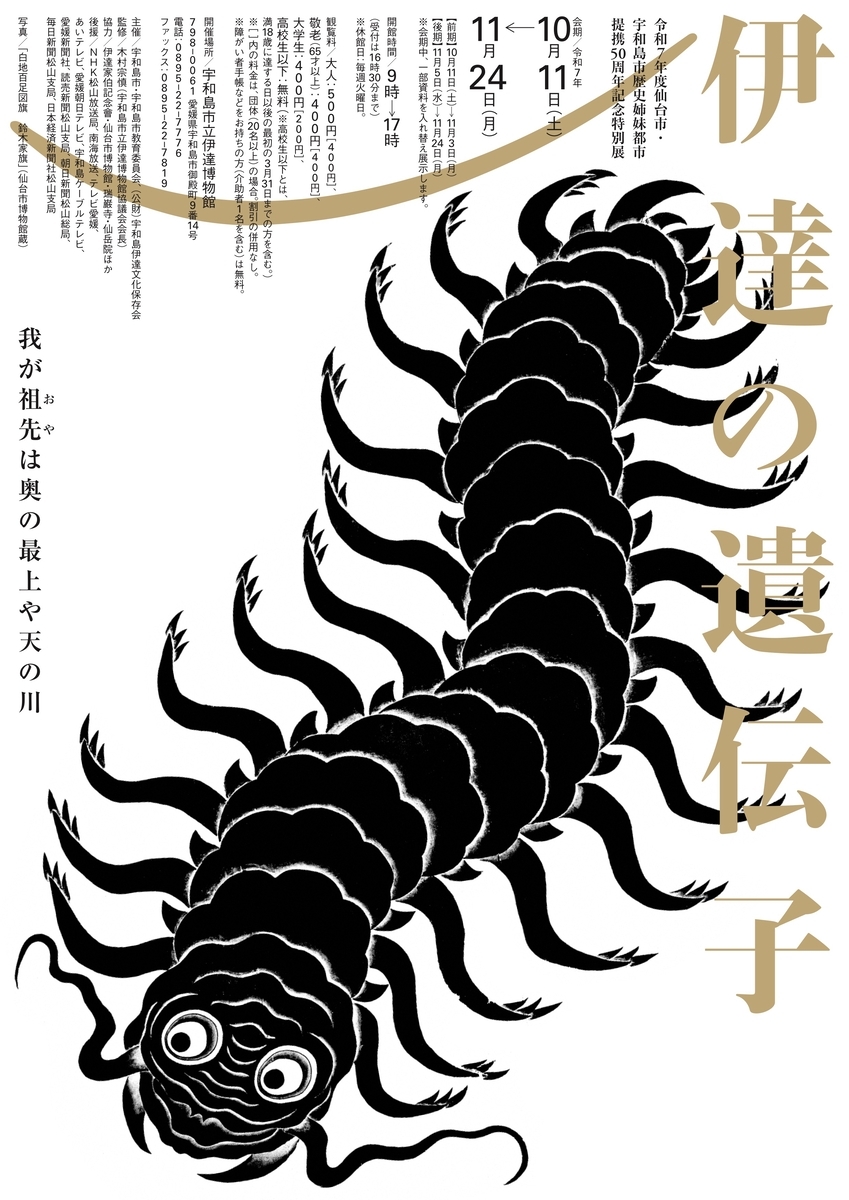 10月11日(土)から11月24日(月)までの間、宇和島市立伊達博物館(愛媛県宇和島市)において令和7年度仙台市・宇和島市歴史姉妹都市提携50周年記念特別展「伊達の遺伝子-我が先祖(おや)は奥の最上や天の川-」が開催されます。大人500円。