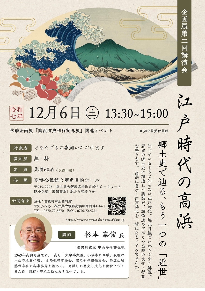 12月6日(土)、高浜公民館(福井県高浜町)において高浜町史刊行記念展関連イベント・記念講演会「江戸時代の高浜」が開催されます。参加無料、定員60人、事前申込不要。