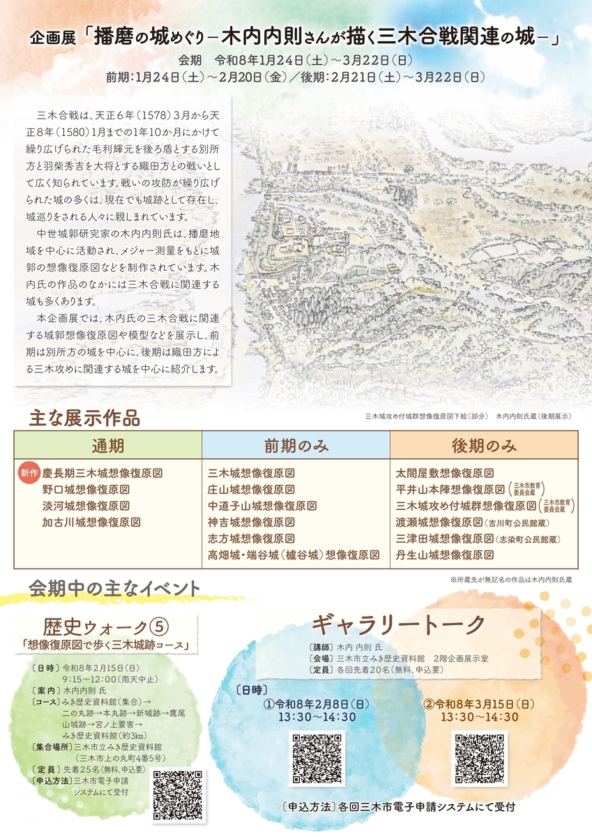 1月24日(土)から3月22日(日)までの間、みき歴史資料館(兵庫県三木市)において企画展「播磨の城めぐり-木内内則さんが描く三木合戦関連の城-」が開催されます。入館無料。